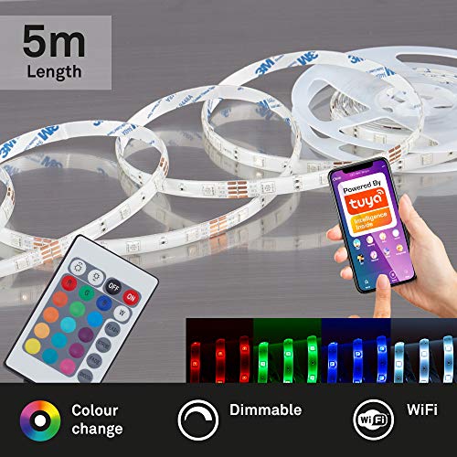 Briloner Leuchten - Striscia a LED, luce LED 5m, autoadesiva, accorciabile, dimmerabile, incl. telecomando, WIFI, controllo da app, Amazon ECHO, funzione cambio colore, bianco, 5.000x10x3mm (LxPxH)