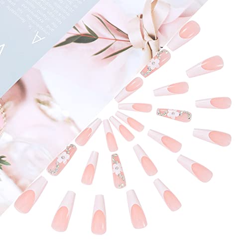 Brishow Unghie finte a bara, unghie finte francesi rosa, a forma di fiore, a pressione, in acrilico, 24 pezzi, per donne e ragazze (B)