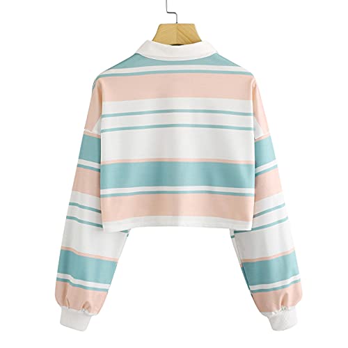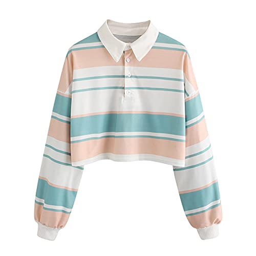 Briskorry Maglia a maniche lunghe con abbottonatura a righe, colletto a righe, tinta unita, top sciolto, polo casual, senza pancia, Verde menta 6., S