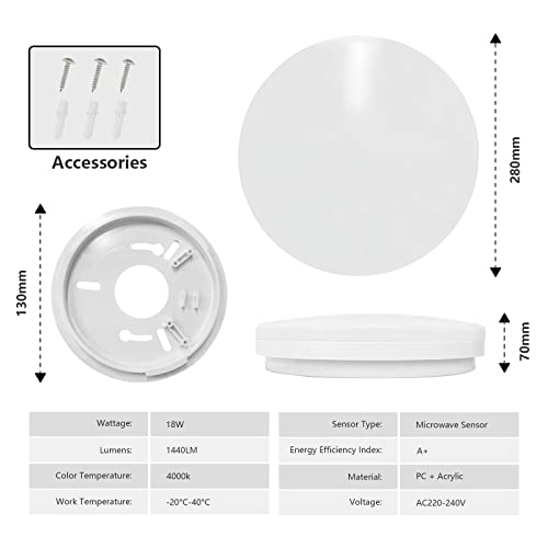 Brisplen Plafoniera LED Sensore di Movimento 18W 4000K Lampada Soffitto Sensore Crepuscolare,Timer Regolabile Rotondo 28 cm IP44 Luce da Bagno per Garage/Cantina/Corridoio/Scale/Portico