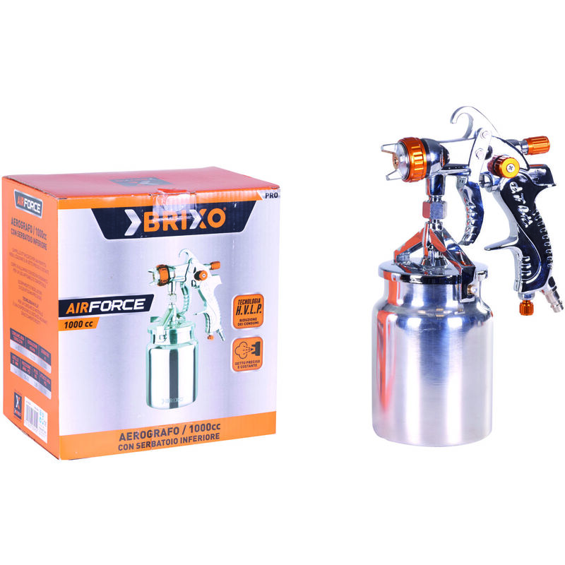 Corpo in alluminio, serbatoio inferiore cc. 1000, getto preciso e costante, ugello in ottone foro ÃË 1,4 mm. - attacco filetto M 1/4. Erogazione 70/230 ml/min. Tecnologia H.V.L.P. (per un consumo di materiale e una dispersione di sostanze inquinanti drasticamente ridotti)
