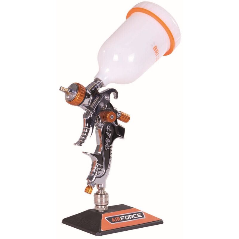 Corpo in alluminio, serbatoio superiore in nylon cc. 600, getto preciso e costante, ugello in ottone foro ÃË 1,4 mm. - attacco filetto M 1/4. Erogazione 100/250 ml/min. Tecnologia H.V.L.P. (per un consumo di materiale e una dispersione di sostanze inquinanti drasticamente ridotti)