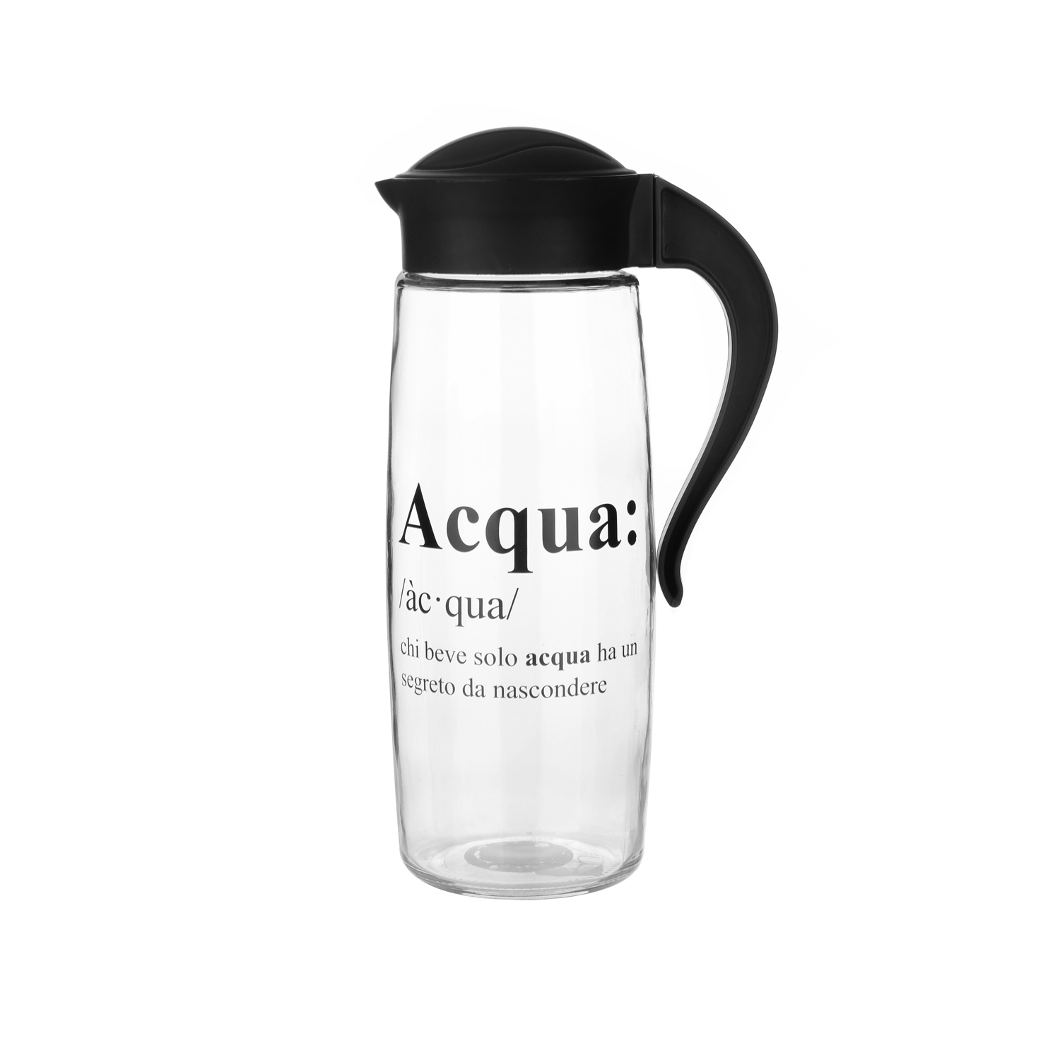 Porta in tavola un tocco di allegria con questa pratica brocca in vetro con frase a stampa. Il design essenziale, e il contrasto tra corpo trasparente e dettagli scuri, sono in pieno stile moderno che unisce eleganza e un pizzico di ilarità per vedere sempre il lato brillante della vita, soprattutto a tavola! Capacità 1,6 lt.