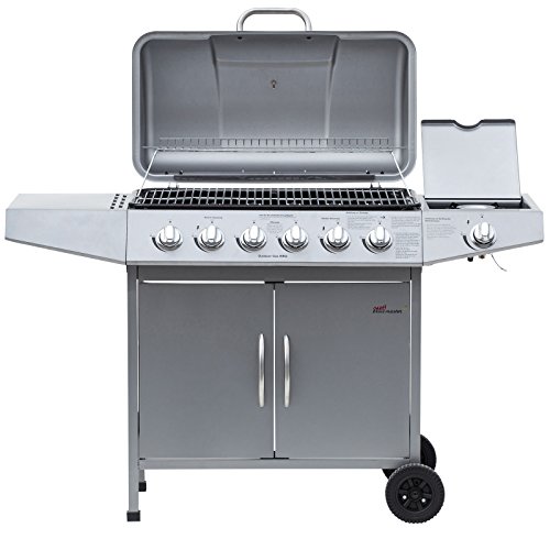 Broil-master, Barbecue a gas, con carrello in acciaio, 6 bruciatori principali + 1 bruciatore laterale, colore: argento