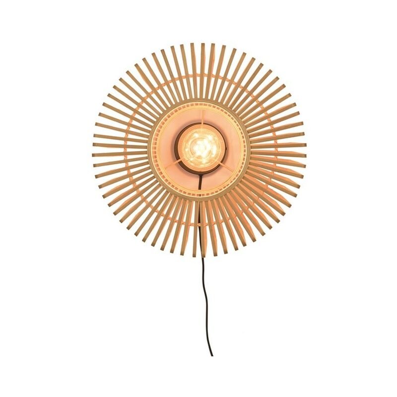 La forma raffinata e contemporanea, si sposa armoniosamente con l'aspetto caldo del legno naturale. Bromo ha una grande leggerezza visiva grazie alla sua struttura traforata. Le doghe di bambù proiettano ombre delicate sulla parete. Il cavo permette di fissare la lampada a piacere sulla parete Questa luce è fatta a mano in Vietnam. GOOD&MOJO fornisce un'illuminazione eco-responsabile realizzata interamente con materiali sostenibili e/o riciclati 1 lampadina E27 max 60W NON INCLUSA IP20 Lunghezza cavo elettrico 250 cm con interruttore ON / OFF Dimensioni: Diametro 40 cm, Sp 20 cm Dimensioni base a parete: Diametro 12 cm, H 2,5 cm