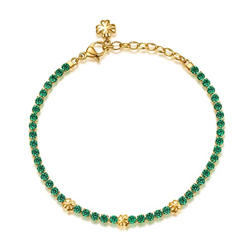 Bracciale tennis in acciaio 304 e pvd oro con quadrifogli, cubic zirconia peridot e pendente chiusura con quadrifoglio.