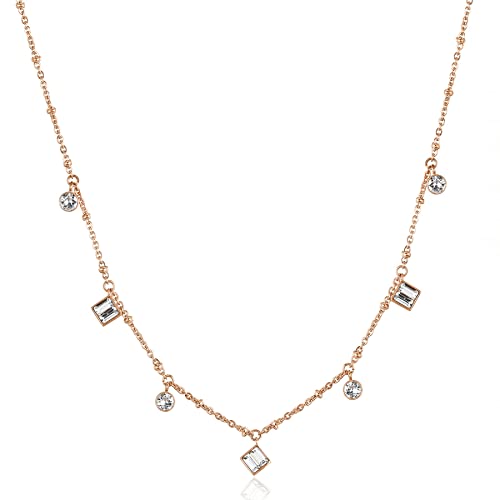 Collana bubble chain girocollo in acciaio 316L, finitura oro rosa, pendenti con cristalli round e baguette swarovski.