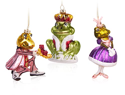 BRUBAKER Set di 3 palline per albero di Natale a forma di rana con rana, dipinte a mano, Principe su richiesta e principessa, decorazioni per albero di Natale in vetro soffiato a bocca