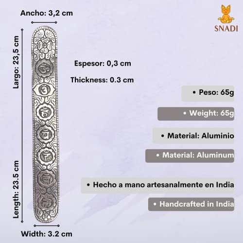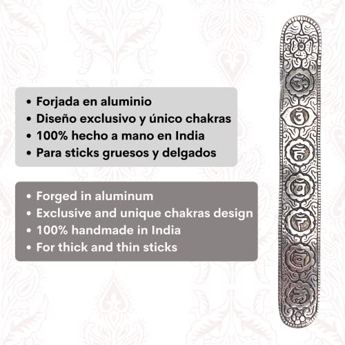 Bruciatore incenso Chakras - Peso 65 g - Porta incenso da 23,5 cm di lunghezza, larghezza 3,2 cm e spessore 0,3 cm. Nota: tenendo conto del carattere artigianale e dell'alluminio, può avere irregolarità nell'aspetto.