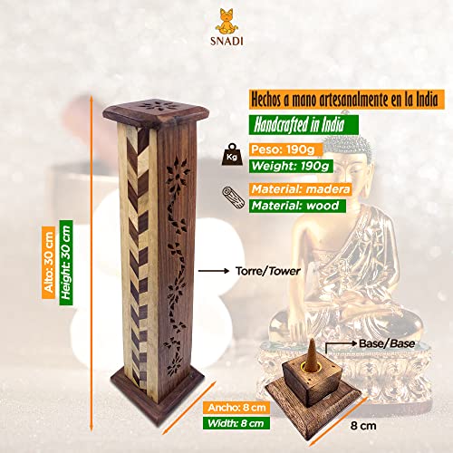 Elegante torre in legno per supporto incensivo a forma di torre intagliata in legno. Design esclusivo e unico con squisita fattura Hindu. Design universale per bastoncini spessi e sottili.