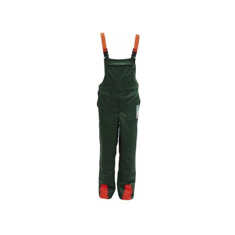 Codice: 8033655186425 Marca: BRUMAR. Cotone 100% sanforizzato gr/mq 260 Colore verde inserti arancioni 2 tasche laterali + tasca centrale con cerniera Bretelle regolabili Protezione antitaglio classe I