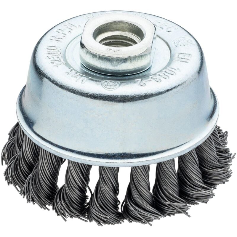 Powerful cup brush for surface treatment Knotted wires provide efficient cleaning Heavy brushing on large surfaces as well as for deburring, derusting and cleaning Steel wire Design with knotted wire 65 mm ⌀ Thread: M14 x 2.0 Maximum 12500 rpm Dimensioni dell'imballaggio 1