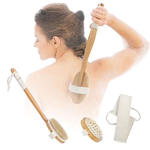 Dry Brushing Body Brush Set - Best for Cellulite, Lymphatic Drainage & Skin Exfoliating - Natural Bristle Spa Kit - Long Handle Back Scrubber, Massager