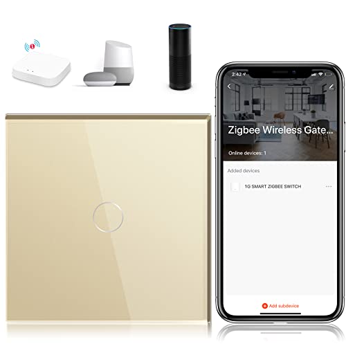 BSEED Smart WiFi Touch Switch Sensor Light Switch (Neutral Feed Needed) Alexa/Tuya Compatible UK Glass Panel Wall Switch, Oro