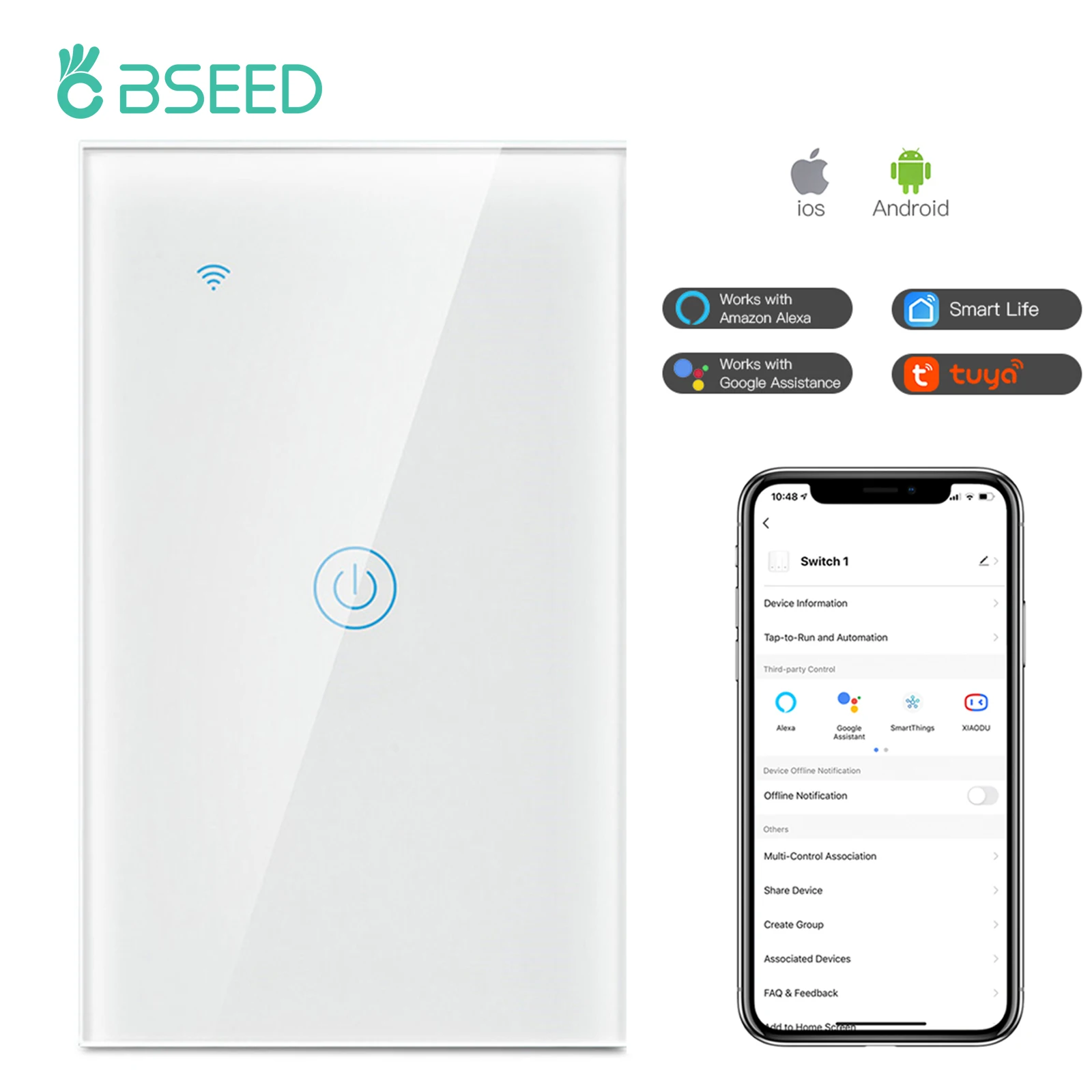 Bseed Wifi Light Switch 1/2/3Gang 1/2/3way White 118mm Smart Wall Touch Switch Glass Wireless LED Backlight APP Google Alexa US
