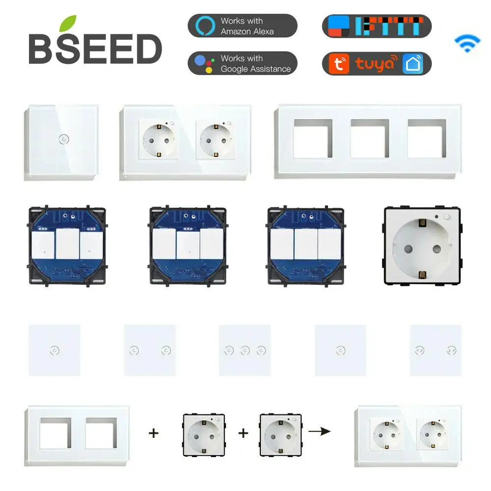 BSEED WIFI Wall Light Switches Glass Panel Parts White Smart Touch Switches Function Parts EU Sockets Power Outlet Parts