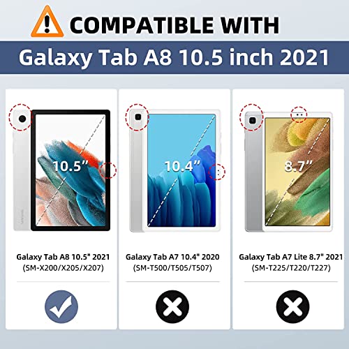 COMPATIBILITÀ: Compatibile solo con tablet Samsung Galaxy Tab A8 2021 da 10,5 pollici (Modello SM-X200 / SM-X205 / SM-X207). Verificare il numero di modello" SM-T *** "facendo clic su" Impostazioni "-" Informazioni sul dispositivo "prima dell'acquisto