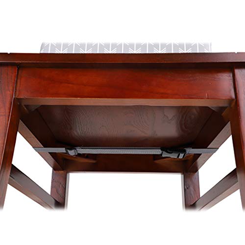 Con 2 cinghie e fibbie regolabili extra forti. Può essere fissato facilmente e in modo sicuro sotto la sedia e non scivola e scivola. Aggiungerà un'altezza di 8 cm, quindi si prega di controllare le dimensioni della sedia e l'altezza tra la sedia e il tavolo.