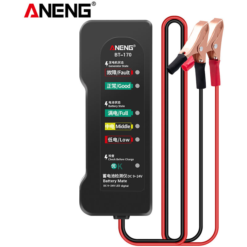 Questo è un tester batteria facile da usare per auto e moto. Supporta la tensione della batteria DC 9-24V e con diverse spie LED per rappresentare diversi stati. Compatto, portatile e leggero, questo strumento può essere ampiamente utilizzato in auto a benzina, auto elettriche, motociclette, motociclette elettriche e così via. Caratteristiche: Tester batteria multifunzione: controlla il livello di carica, il promemoria di sovraccarico della batteria, il test funzionale della batteria, controlla le prestazioni di avviamento della batteria. Questo strumento supporta la gamma di tensione della batteria DC 9-24V ed è facile da usare. Diverse spie LED per rappresentare stati diversi, visivi e chiari. La clip a coccodrillo è realizzata in materiale placcato in rame puro, con un'ampia gamma di apertura e una forte forza del morso, garantendo una misurazione più accurata. Il prodotto non ha fori per le viti e non è facile da arrugginire. Con aspetto semplice, durata della vita di lunga