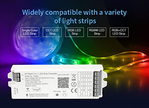 BTF-LIGHTING 5in1 LM053 Tuya Bluetooth Mesh LED Controller APP Control per la regolazione del CCT RGB RGBW RGBCCT LED Lavoro con WR01RF WR02RF RC02RFB RC03RFB ecc RF Remote DC12V DC24V Max 15A