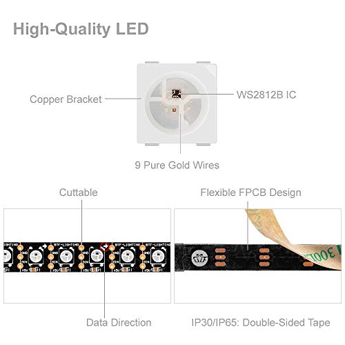Indirizzabile individualmente Striscia LED programmabile a colori da sogno, LED WS2812B, CI WS2812B incorporato 5050SMD. Effetto statico, effetto inseguimento, effetto speciale, ecc. Display di luminosità .256 e display a colori a 24 bit.