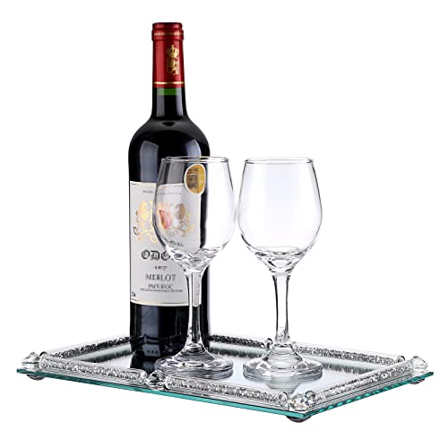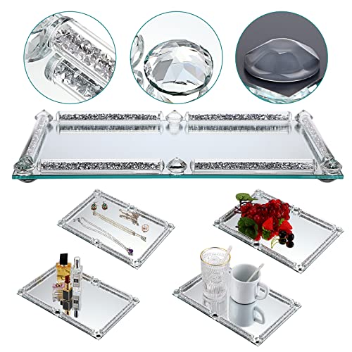 Materiale in vetro di alta qualità e design unico: questo vassoio è realizzato in vetro di alta qualità, che è studio e durevole. Si tratta di un vassoio rettangolare con cornice cilindrica e specchio all'interno. La cornice cilindrica è riempita con piccoli strass, scintillanti e attraenti. La parte inferiore ha quattro piedini di supporto, che potrebbero mantenere il vassoio stabile e proteggere il tavolo