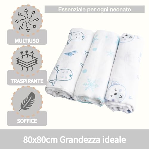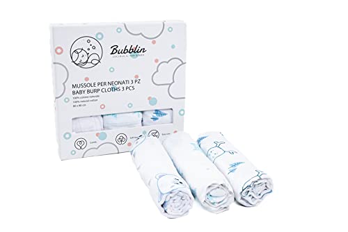 Bubblin, Set di 3 Mussole Neonato, 80x80 cm, Teli Neonati Quadrati, Tessuto doppio,100% Cotone Naturale, Certificato OEKO-TEX, Copertina Neonato, Unisex, morbide e soffici, Regalo Neonati (Orsetto)