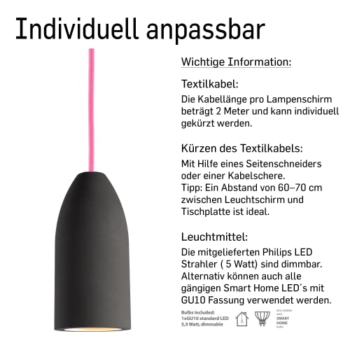 Buchenbusch urban design Dark Edition, set da 4 lampade a sospensione in calcestruzzo con lampadina LED A+, stile industriale, cavo rosa fuxia