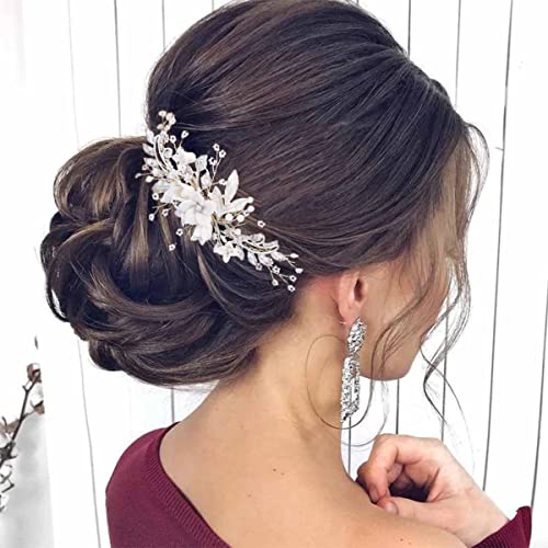Bufenia Pettine per capelli in cristallo da sposa Lati fermagli per capelli a fiore bianco Accessori per capelli da sposa in argento per la testa da sposa per matrimonio
