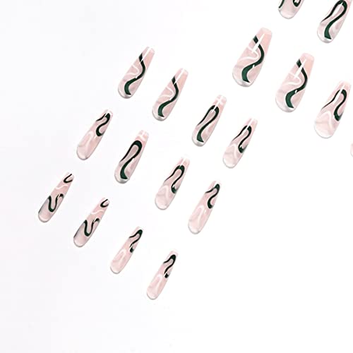 Bufenia, Unghie finte ballerina, lunghe e adesive, con linee ondulate, con glitter, rosa, leopardato, fiamma, acrilico lucido, unghie adesive per donne e ragazze, 24 pezzi (B)