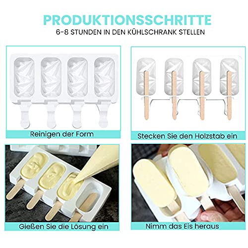 【HEALTHY LIFE】 Abbiamo 2 set di Popsicle Stampi, 4 cavità e 100 bastoncini di legno. Può preparare 8 gusti diversi di gelato contemporaneamente. Puoi usare succhi, yogurt, frutta, gelato, budino, marmellata, ecc. Per fare il gelato. Tenere lontano dai ghiaccioli che contengono additivi e pigmenti sul mercato. Il gelato fatto in casa è più sano e più delizioso. È la scelta migliore per bambini, ragazzi e adulti.