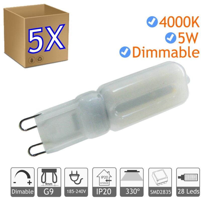 G9 lampadina a LED regolabile di 5w, lampadina in miniatura ad alte prestazioni per posizionare lampade decorative, lampade da tavolo, ecc ... Regolazione tra una luce 40% e 100% 5W G9 LED Bulb ha il tipo G9 La lampadina G9 è regolabile (dimmerabile) con dimmer elettronici triac La luce è bianco naturale di 4000k, che fornisce alla lampadina a LED da 5 W una luce naturale per una buona illuminazione senza rendere la luce molto dura. Long 60 mm incluso connettore, diametro 16 mm Questa lampadina a LED da 5 W G9 risparmia sul consumo di elettricità ed è più rispettosa dell'ambiente. dotato di 24 LED 2835 Questa lampadina a LED da 5 W, ottiene 220 lumen in un posto molto poco. attenzione > Reference Power 4W regolabile Regolamentazione tra il 40% e il 100% di luce connettore G9 Food lumins lumens flow 475 lum Color Light Natural White 4000OK Angolo di illuminazione
