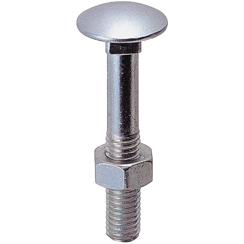 In acciaio zincato classe 4.8. Testa tonda con quadro sotto testa. Dadi esagonali DIN 603 - 555. Diametro 6 mm Lunghezza 45 mm