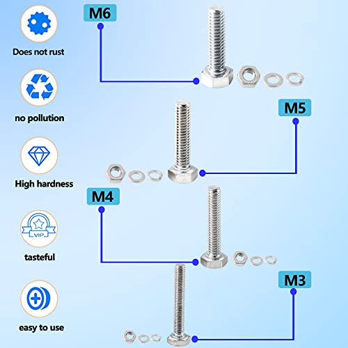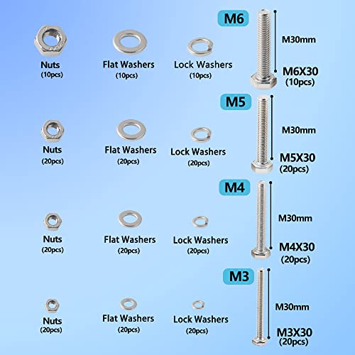 M3 M4 M5 M6 Bulloni e Dadi di Rondelle Kit 30mm Bulloni e Dadi Viti a Testa Esagonale in Acciaio Inox 304 Bulloni Esagonali Meccanici Rondelle Anelli a Molla e Dadi 280pezzi