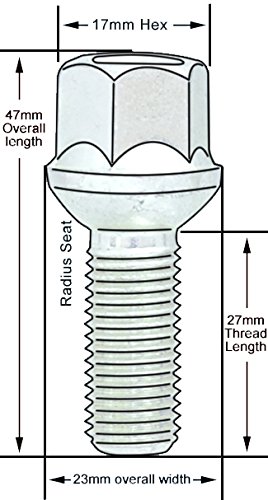 Set da 20 bulloni in lega M14 x filettatura 1,5, lunghezza 27 mm, sedile raggio, esagonali, 17 mm, adatto per Audi