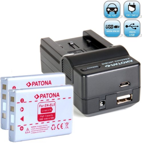 Contenuto della confezione: 1 caricatore Patona, 1 base di ricarica per Nikon EN-EL5, 1 adattatore per auto, 2 batterie sostitutive Bundlestar (Patona) per Nikon EN-EL5
