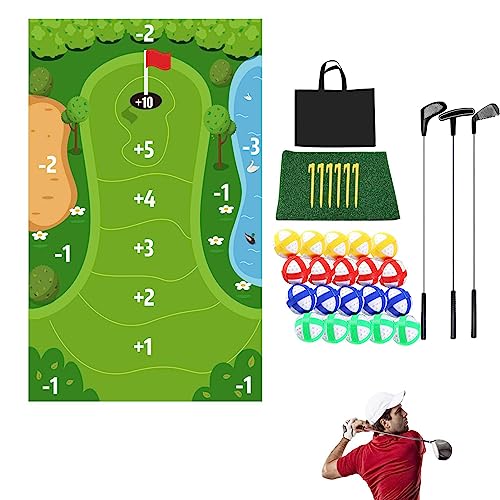 Set da golf versatile e conveniente Ha un tappetino da gioco con diverse zone di punteggio per varie sfide, un tappetino da battere dal look classico, una barra da allenamento facile da usare, 20 palline adesive che si attaccano bene al tappetino da gioco, 6 chiodi da pavimento che tengono i tappetini in posizione e una borsa portaoggetti nera e pratica.