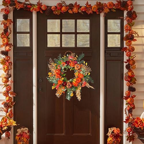 Buogint Corona autunnale di peonie e zucche, corona di zucca per tutto l'anno con foglie d'acero e bacche, ghirlanda per casa d'ingresso, decorazione per la casa, festival del raccolto autunnale,