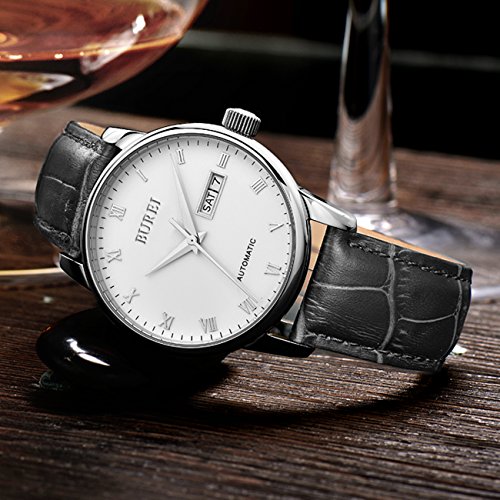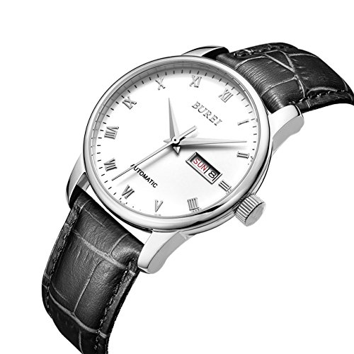 Burei lusso orologio automatico uomo Day date elegante orologio meccanico in numeri romani con cinturino in pelle nera impermeabile 50 m