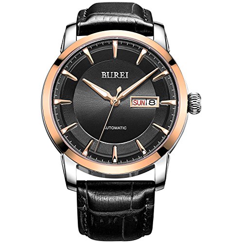 BUREI Orologio automatico di giorno e di vigilanza classico dell'uomo di BUREI con la fascia di vitello