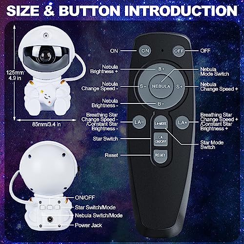 Viaggio nello spazio attraverso le stelle scintillanti: Il proiettore galattico astronauta ha 8 modalità di nebulosa (rosso, blu, verde, rosso-blu, blu-verde, rosso-verde, sfumatura a due toni, mix a tre toni) e 2 modalità di stella (respiro, luce costante), nebulosa e stelle possono essere illuminate contemporaneamente o separatamente, può essere utilizzato come luce notturna da comodino per accompagnare i bambini a dormire, portare una romantica notte stellata.