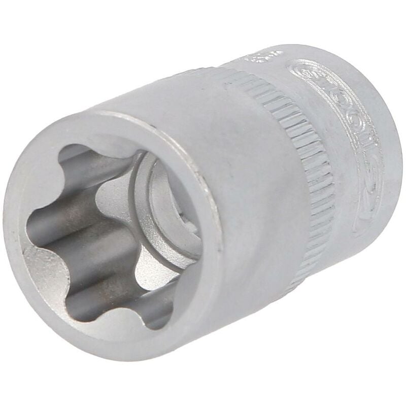 Torx profilo E Quadro femmina a norma DIN 3120 / ISO 1174 con sede per sfera di tenuta Per utilizzo manuale Cromata opaca Cromo-vanadio Dimensione della chiave in E-TORX E22 Azionamento quadro in pollici 1/2 Lunghezza totale L in mm 40.0 Standard DIN 3120, ISO 1174 Profondità T in mm 14.0 Profilo 1 E-TORX® Diametro D1 26.0 Peso del tessuto 80 Diametro D2 25.0 Dimensioni dell'imballaggio 1 Materiale1 Feinster Chrom Vanadium Stahl, matt satiniert verchromt Forma gerändelt