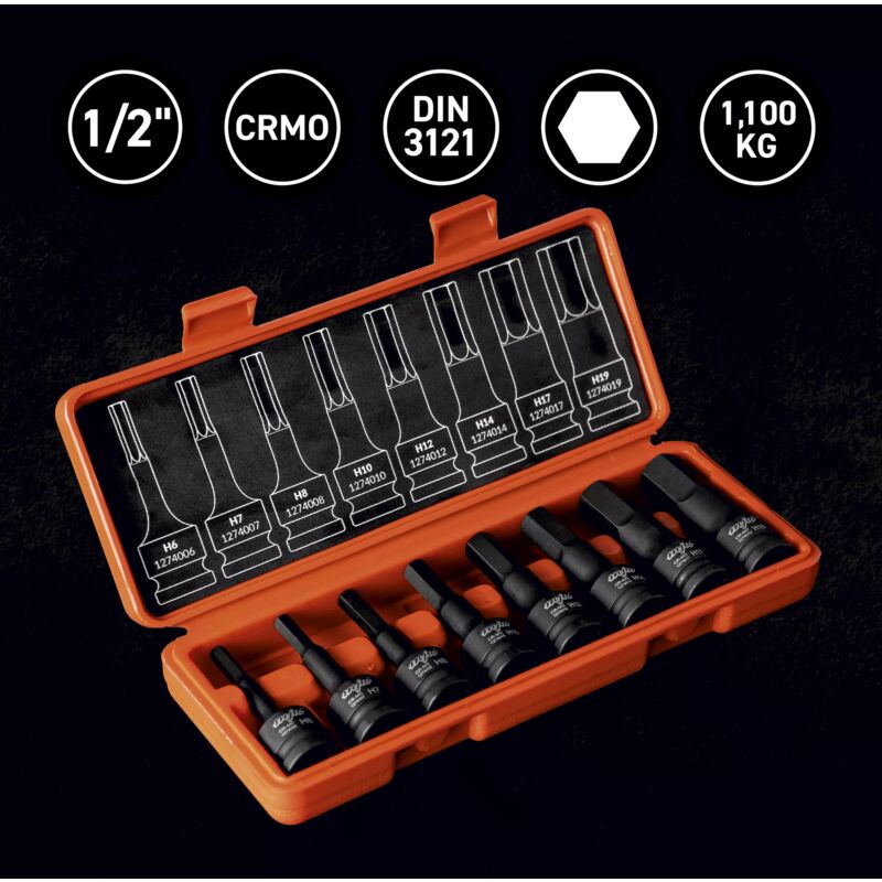 Numero di elementi: 8Contenuto: H6 | H7 | H8 | H10 | H12| H14 | H17 | H19 Acciaio di altissima qualità Acciaio al CrMo Tipo di punta HEX Azionamento per chiavi pneumatiche e manopole con un diametro di 1/2" Foro di sicurezza garantisce un funzionamento sicuro, adatto a lavorare con chiavi pneumatiche della massima qualità Lavorazione estetica, il set è stato realizzato in conformità con i più alti requisiti dei nostri clienti, sia estetici che tecnici. Informazioni sulla scatola Grazie alla stampa sulla schiuma posizionata sul coperchio interno della scatola, troverai facilmente la chiave di cui hai bisogno. Imballaggio resistente, resistente, in plastica la scatola con dimensioni di 248" 102" 48 mm resisterà alle condizioni di lavoro più difficili