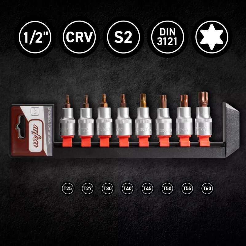 Contenuto: Bussole TORX 1/2" T25 | T27 | T30 | T40 | T45 | T50 | T55 | T60 Un set essenziale per ogni servizio agricolo e automobilistico. Contiene 8 bussole 1/2" necessarie per ogni riparazione meccanica. Punte in acciaio S2. Un portaprese in plastica resistente manterrà l'ordine in ogni officina.
