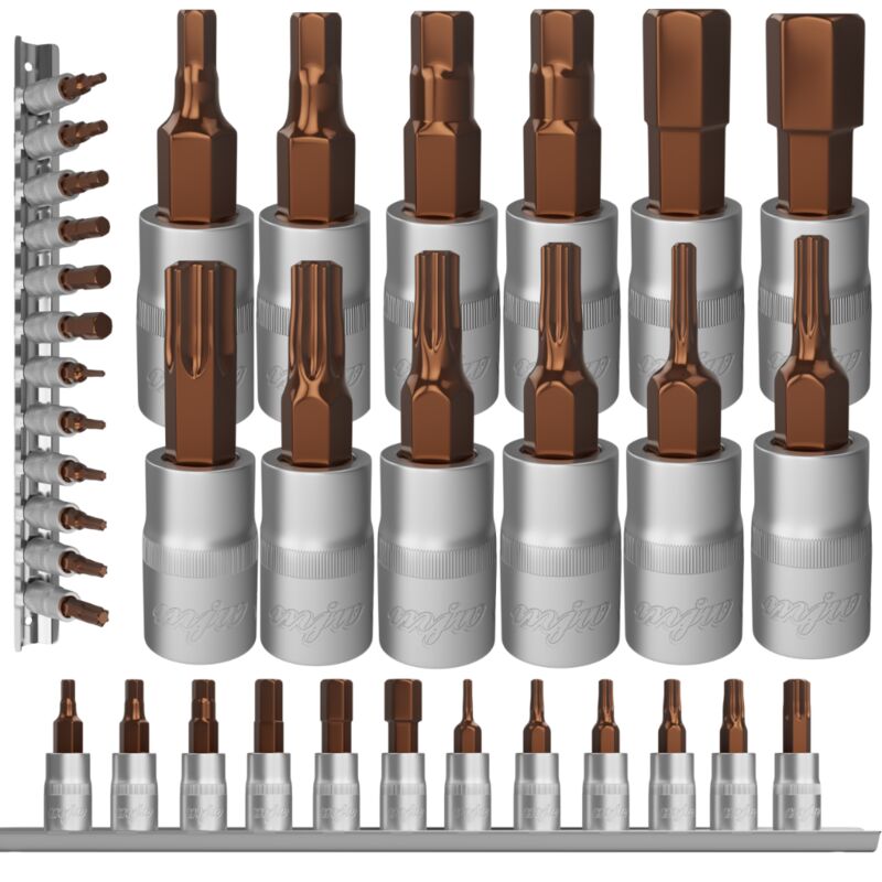 Contenuto: 12 bussole con gambo su guida metallica Bussole TORX 1/4": T10 | T15 | T20 | T25 | T30 | T40 Bussole HEX 1/4": H3 | H4 | H5 | H6 | H7 | Prese H8 realizzate in resistente acciaio CrV al cromo-vanadio. Punte della presa realizzate in acciaio legato S2 di alta qualità. Il set soddisferà le aspettative dei professionisti più esigenti. La qualità degli strumenti del marchio MJW è confermata da una garanzia a vita.