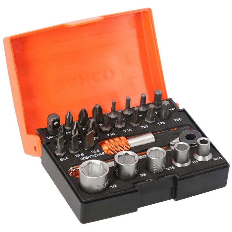 Set di bussole e inserti per avvitare BAHCO 2058/S26 - Acciaio legato ad alte prestazioni - Finitura: zincata fosfatata (inserti), cromata (bussole) e placcata (cricchetto) - Avvitamento più rapido grazie al meccanismo a cricchetto - Per uso universale Contenuto - 18 inserti: + 3 inserti Slots: SL4 / SL5 / SL6 + 3 inserti Philips: PH1 / PH2 / PH3 + 3 inserti Pozidriv: PZ1 / PZ2 / PZ3 + 5 inserti Torx: T10 / T15 / T20 / T25 / T30 + 4 inserti Hex: HEX3 / HEX4 / HEX5 / HEX6 - 5 bussole 1/4: Ø 6 / 7 / 8 / 10 / 13 mm - 1 cricchetto 1/4 - 1 porta-inserti a rilascio rapido - 1 adattatore per bussole 1/4