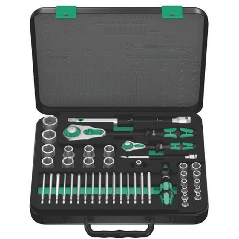Set di bussole e inserti per avvitare WERA 8100 SA/SC 2 Zyklop Speed-Knarr. 1/4 - La dentatura fine con 72 denti permette un angolo di richiamo ridotto di soli 5° - La testa del cricchetto è orientabile ed è possibile bloccarla in ogni posizione grazie alla levetta posta su entrambi i lati - È possibile lavorare con libertà di movimento, anche in spazi ristretti e difficilmente raggiungibili - Le posizioni di blocco predefinite a 0°, 15° e 90° a sinistra e a destra garantiscono di lavorare in sicurezza senza che la testa del cricchetto scivoli - Nella posizione a 0° il cricchetto, con un adattatore e un inserto, può essere utilizzato come un normale giravite - La massa centrifuga accelera l'avvitamento - L'impugnatura Kraftform con la sua struttura a rotazione simmetrica e il suo manicotto flottante permettono una rotazione super rapida - La forma dell'impugnatura Kraftform impedisce la formazione di bolle o calli - I materiali utilizzati per l'impugnatura garantiscono un cambio della