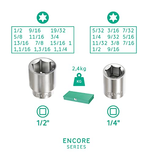 CONTENUTO - 24 inserti per prese esagonali nelle misure 1/4" drive: 5/32", 3/16", 7/32", 1/4", 9/32", 5/16", 11/32", 3/8", 7/16", 1/2", 9/16" e 1/2" drive: 1/2", 9/16", 19/32", 5/8", 11/16", 3/4", 13/16", 7/8", 15/16", 1", 1. 1/16", 1.3/16", 1.1/4".