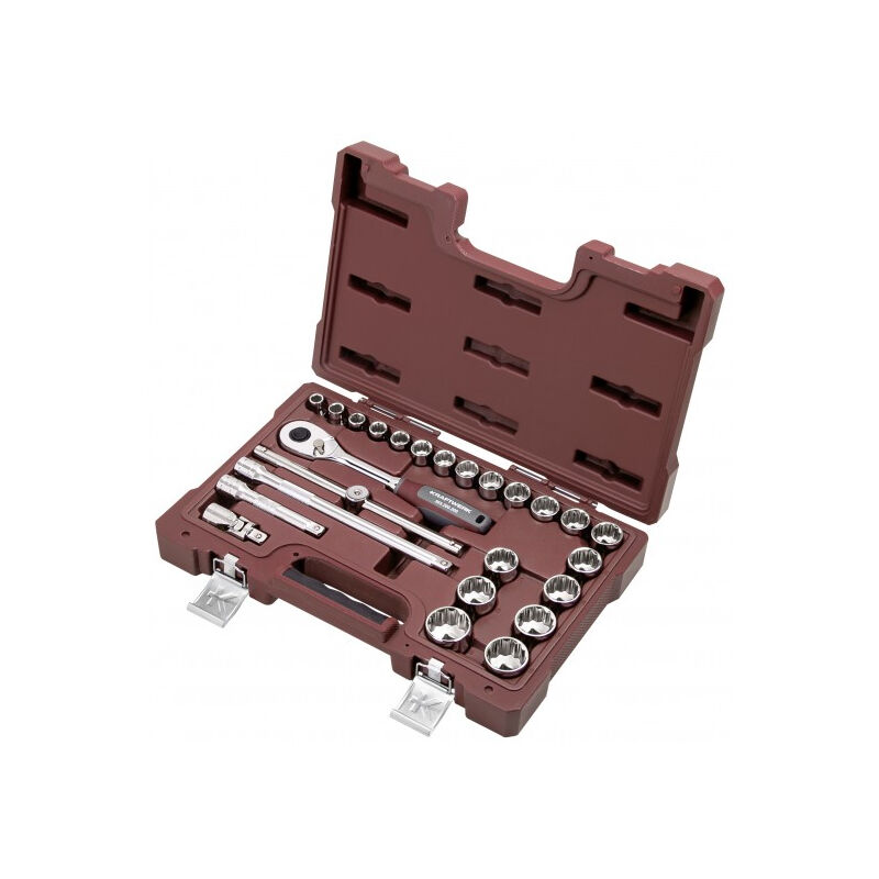 Dettagli: Questo set è composto da: - Cricchetto reversibile, 72 denti - Bussole da 10 a 32 mm - Estensioni Dimensioni: 410 x 265 x 80 mm Peso: 4,62 kg
