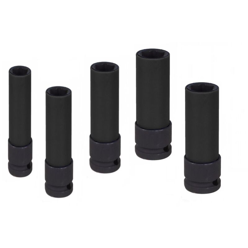 Serie di 5 bussole in acciaio temperato cromo molibdeno. Adatte per avvitatori ad impulsi, fermo corsa interno in resina vinilica per evitare di graffiare i bulloni.